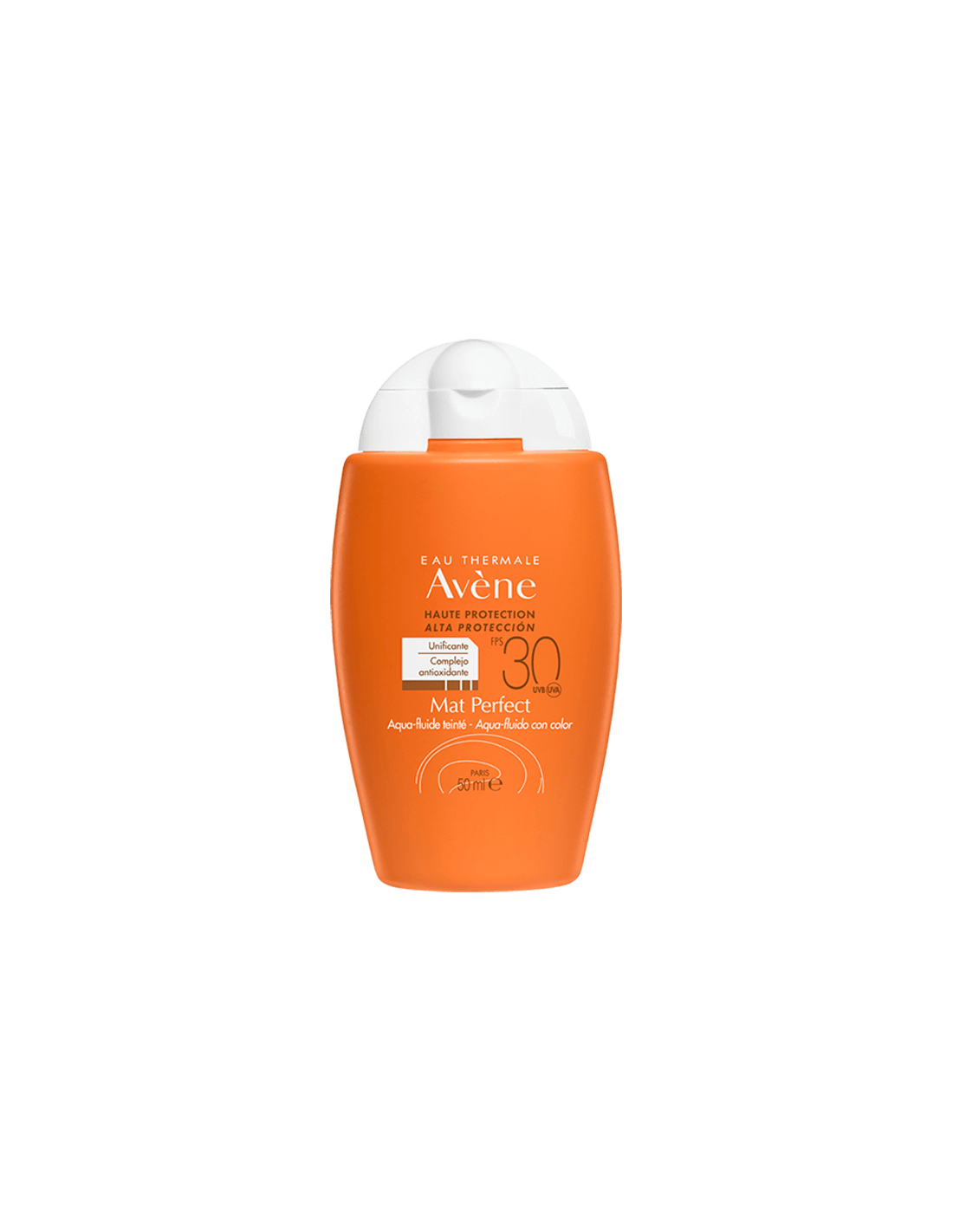 AVENE MAT PERFECT AQUA FLUIDO CON COLOR SPF 30 - Este protector facial es ideal para pieles sensibles normales o mixtas con tendencia grasa. Cuenta con protección de amplio espectro UVB y UVA. Es fotoestable. BENEFICIOS: - Deja un acabado mate en el rostro y ayuda a controlar los brillos. - Absorbe el exceso de sebo y el sudor. - Fórmula con vitamina C que lleva a cabo una acción antioxidante, neutralizando la acción dañina de los radicales libres. - Contiene además Agua termal de Avene: calmante y anti irritante. - Textura aquafluida que se absorbe rápidamente. - Ideal para uso diario. - No deja residuos blancos en el rostro.
