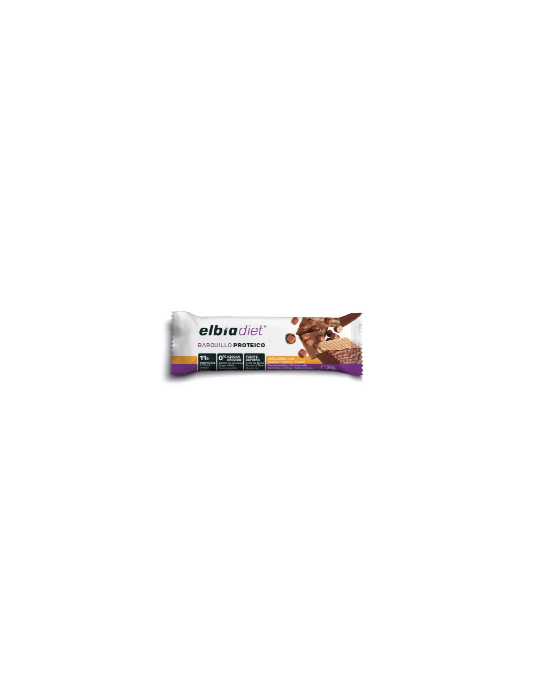 Barquillo proteico 1 unidad de Elbia diet. Sabor avellana. Barrita de galleta recubierta de chocolate y sabor a avellana. Rica en proteínas, bajo en azúcar y alto contenido en fibras. Indicado para adultos.