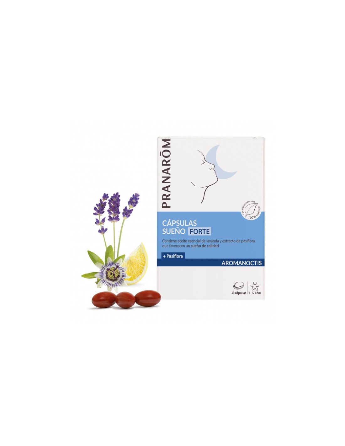 PRANAROM AROMANOCTIS CAPS FORTE SUEÑO 30 CAPS contiene una mezcla de extractos de plantas medicinales, como la valeriana, la pasiflora y la melisa, conocidas por sus propiedades relajantes y sedantes. También contiene aceites esenciales de lavanda y naranja, que ayudan a crear un ambiente propicio para el descanso.