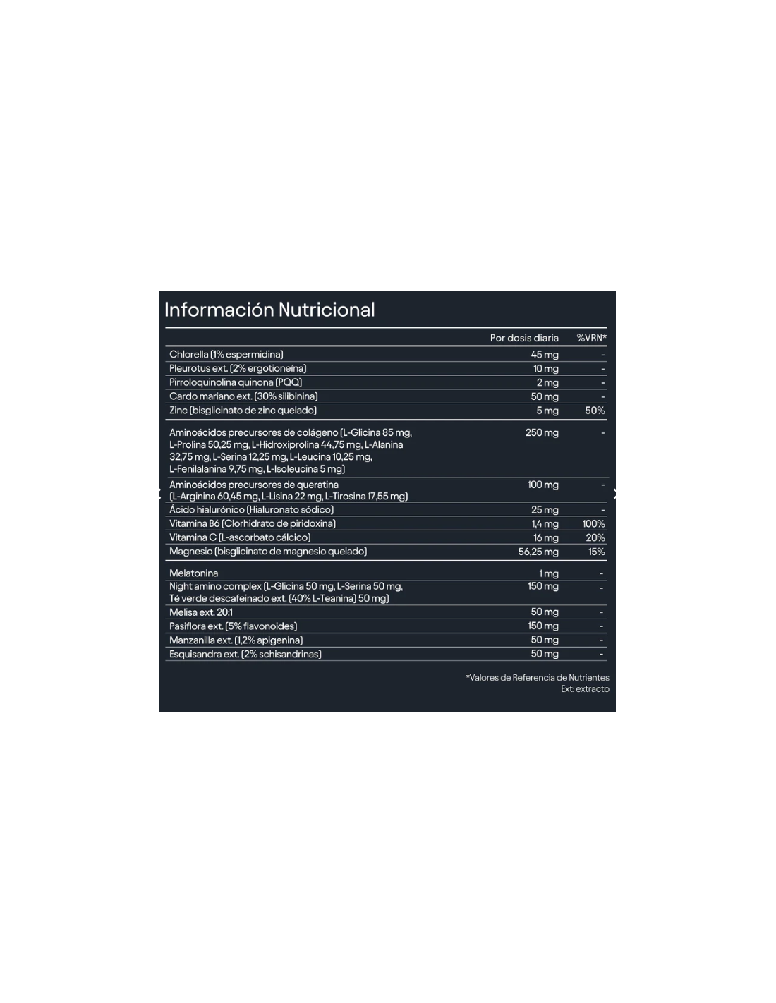 Nuestra fórmula única combina más de 17 ingredientes de alta calidad de origen natural, incluyendo aminoácidos, vitaminas y minerales que contribuyen al mantenimiento del cabello en condiciones normales, así como extractos botánicos que contribuyen a la regeneración celular, la relajación y la conciliación de un sueño reparador.