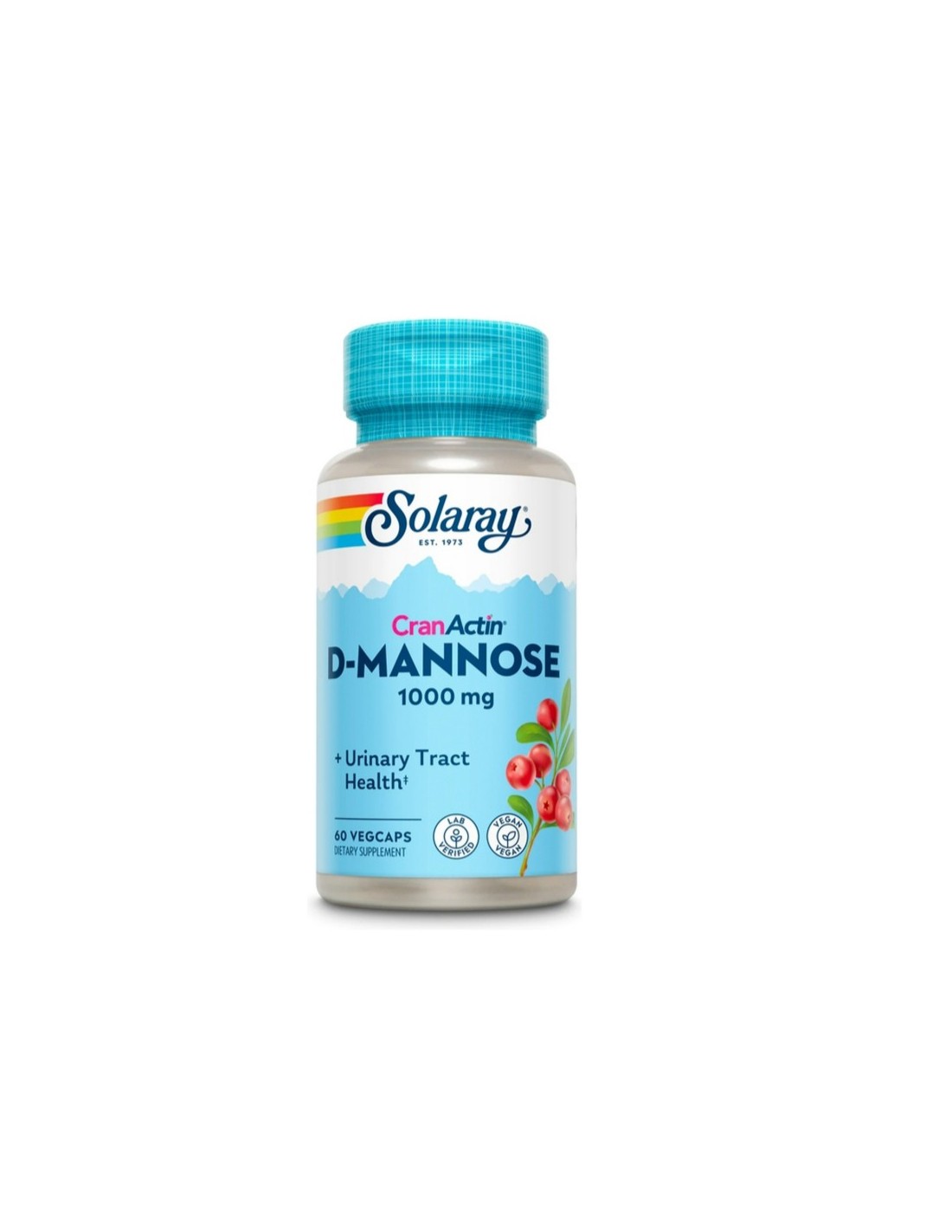 Solaray D-Mannose con Cranactin de Solaray es un complemento alimenticio a base de arándano rojo americano y d-manosa, para el bienestar de las vías urinarias.