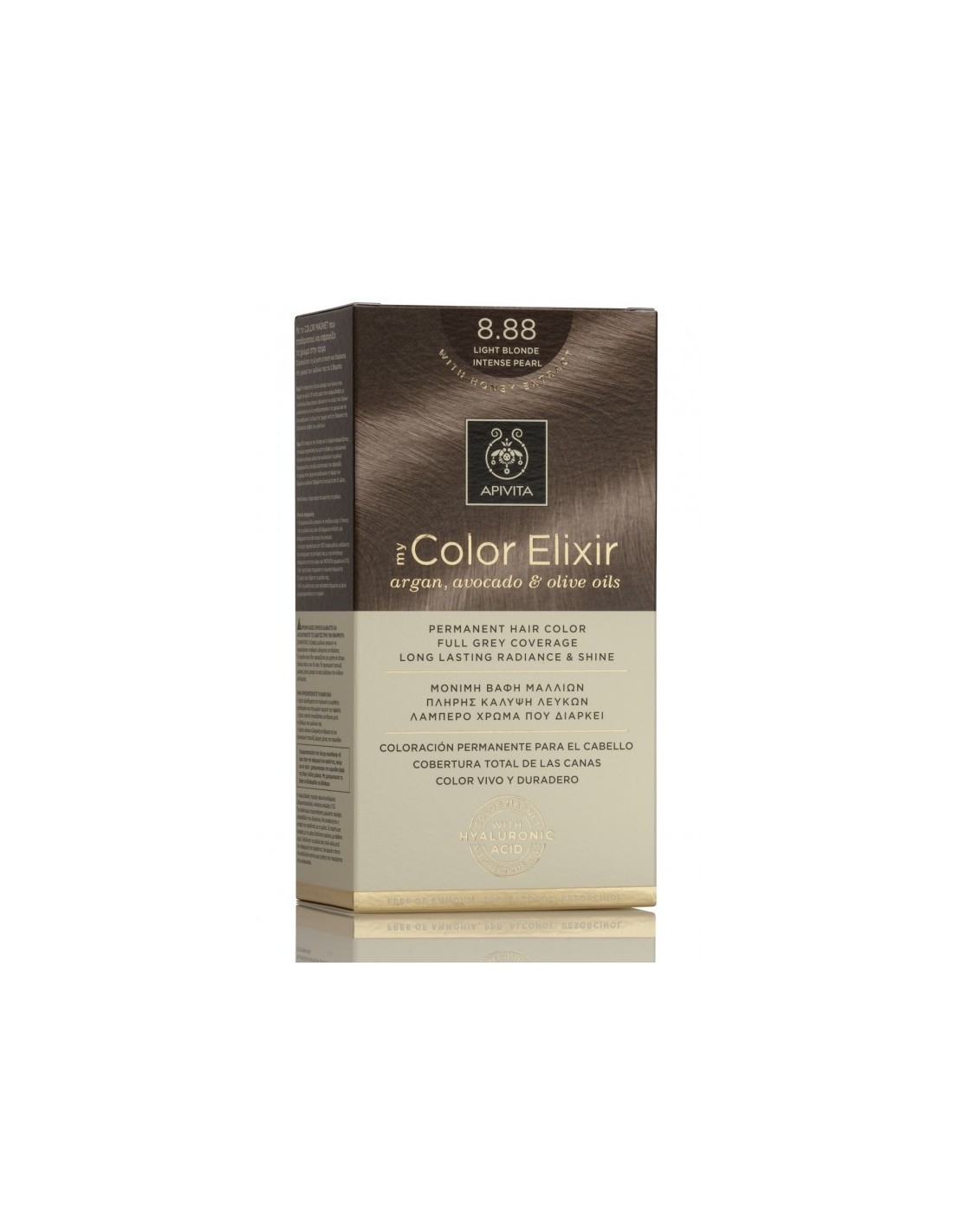APIVITA TINTE 8.88 RUBIO CLARO PERLADO INTENSO es un tinte para el cabello que proporciona un color rubio claro perlado intenso y duradero.