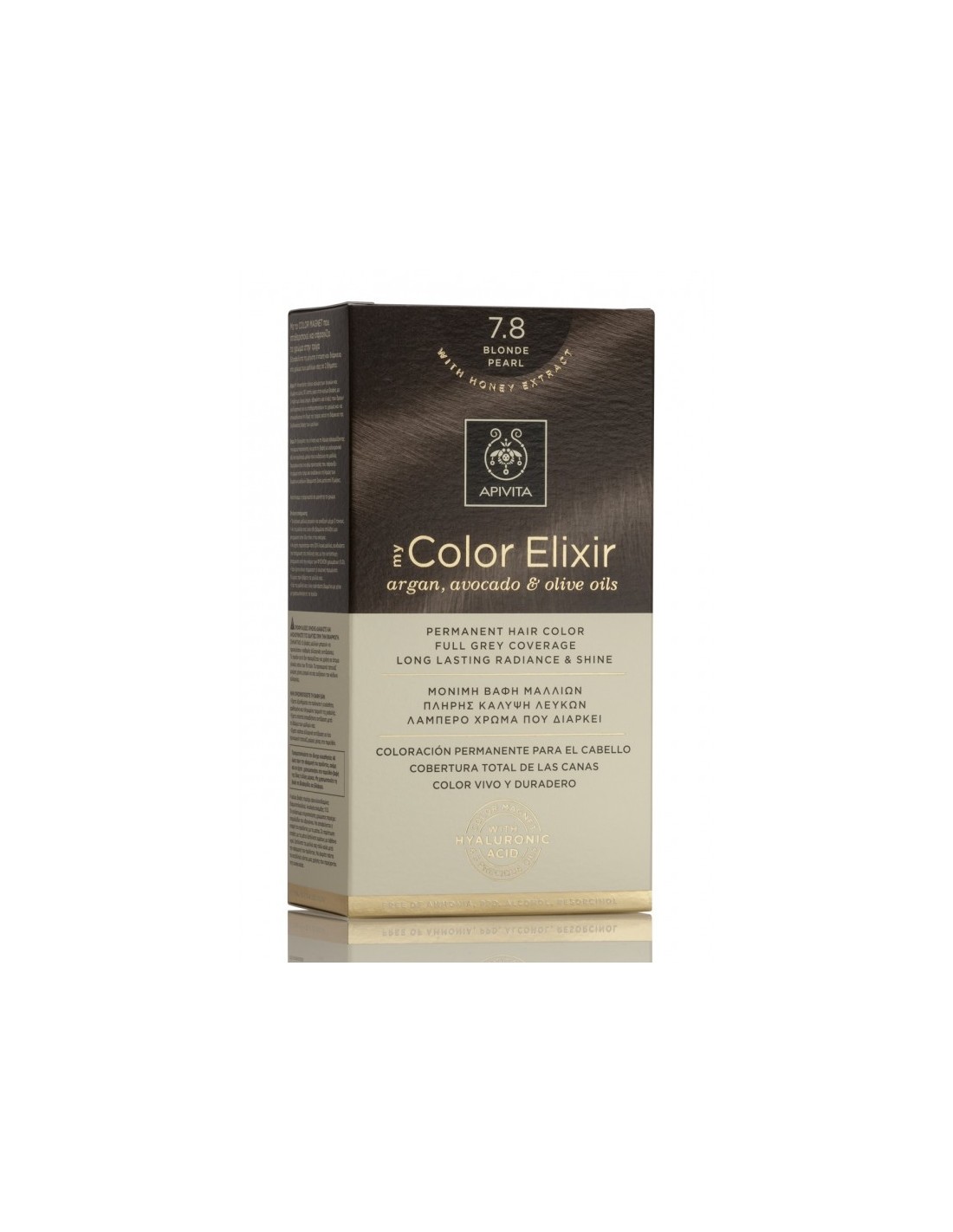 APIVITA TINTE 7.8 RUBIO PERLADO es un tinte para el cabello que proporciona un color rubio perlado intenso y duradero.