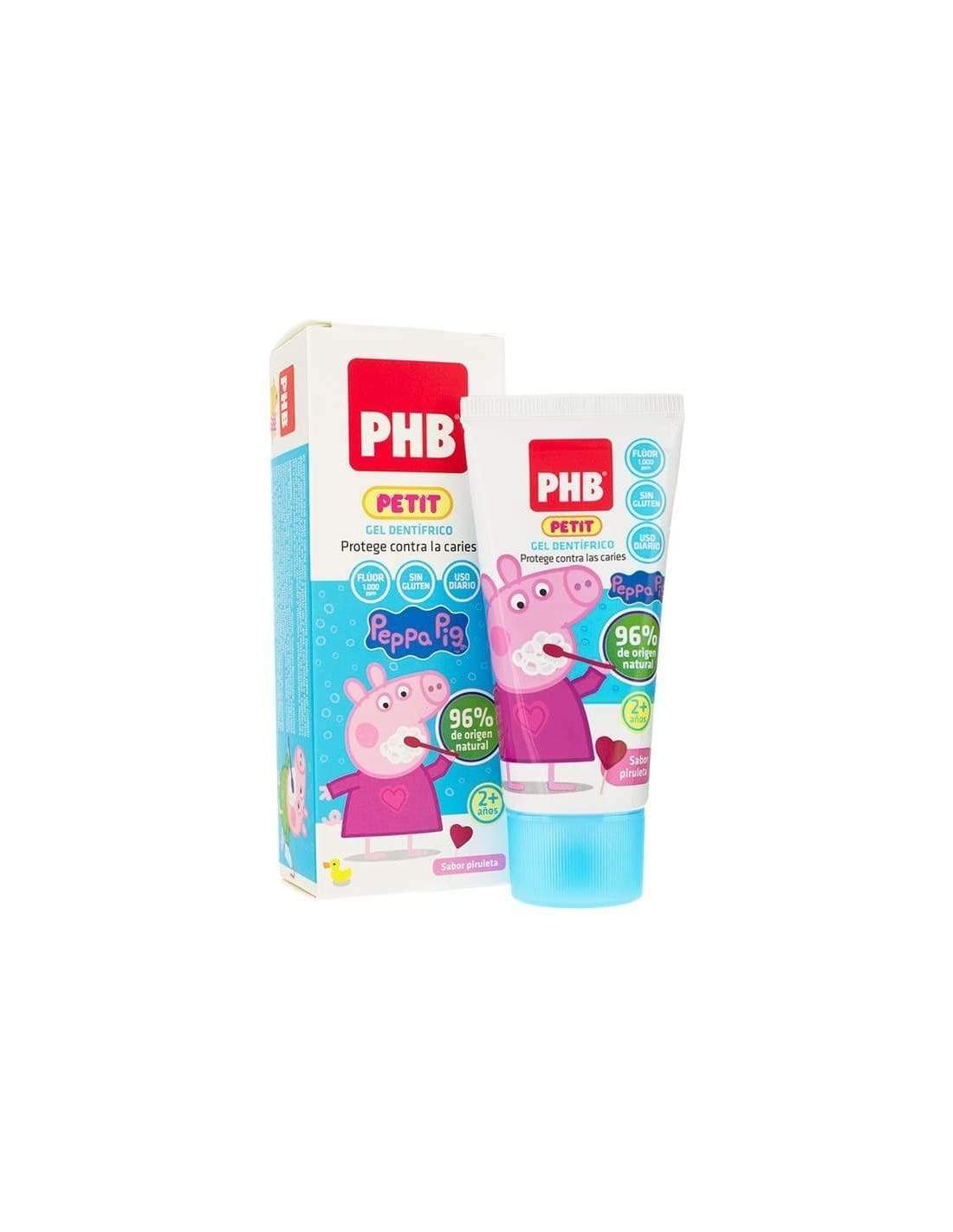 PHB PETIT PEPPA GEL DENTAL INFANTIL es un gel dental especialmente diseñado para niños de 2 a 6 años. Contiene 50 ml de producto y tiene una concentración de 1000 ppm de fluoruro.