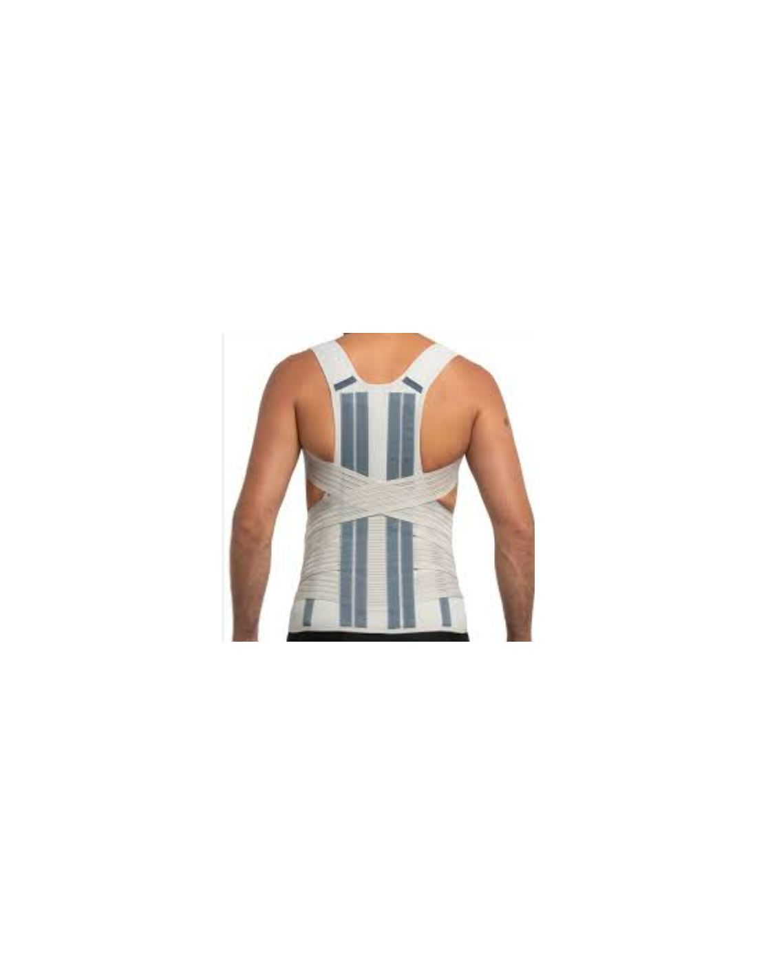 Estabilización dorsolumbar nivel IV. Confeccionada en tejido tricapa no elástico con gran capacidad de adaptación. 4 ballenas paravertebrales de acero conformable y 2 laterales aportan elevada estabilización. Un triple tensor elástico aumenta la compresión en la zona lumbar. La contención en la zona inguinal se asegura con 2 ballenas de acero en espiral. Tirantes regulables que activan la retropulsión de los hombros. Cierre microvelcro para un ajuste seguro.